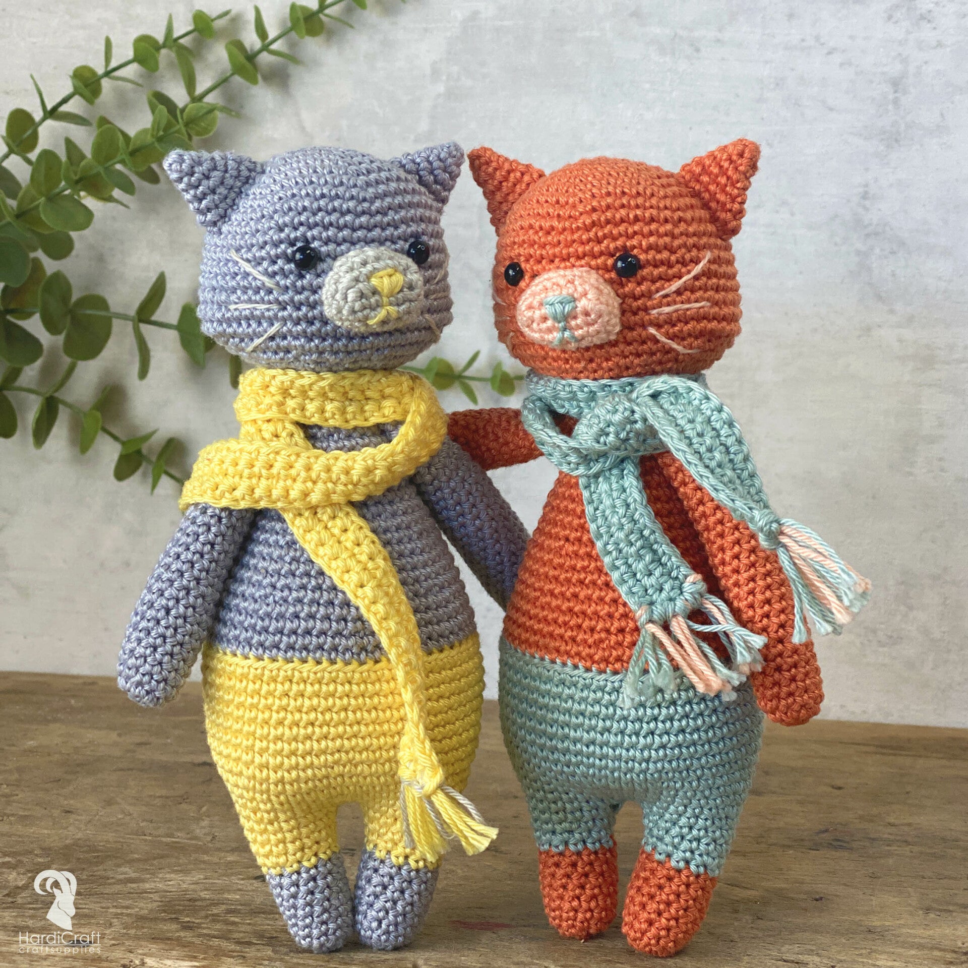 Deze kat met sjaal wordt gehaakt met 3 kleuren kwaliteitsgaren van katoen en wordt ongeveer 21 cm lang.