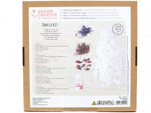 De kit bevat gedroogde bloemen die je creaties zullen verfraaien. Je hebt de keuze tussen korenbloem, heide en rozenknopjes om je zelfgemaakte kaarsen een beetje lentetint te geven.