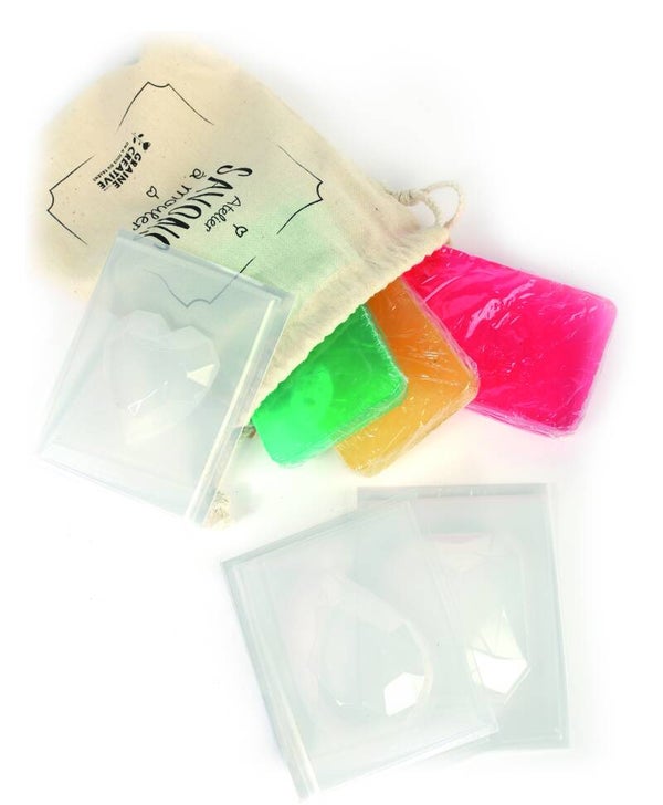 De vormzeep-kits met stukjes zeep en mallen in de verpakking van een mooie 100% katoenen zak.