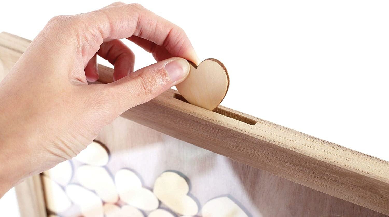 Dit berichtenframe heeft een opening aan de bovenkant, waardoor de meegeleverde hartjes naar binnen glijden. Schrijf, teken of kleur op de hartjes in voor je gepersonaliseerde berichten. Eenmaal in het raamkozijn gestoken, vormen ze een wirwar van herinneringen. Om neer te zetten of op te hangen. Voor een feestje, een gastenboek, een afscheidscadeau of andere bijzondere gelegenheden. Deze houtenlijst is een originele manier om een leuke gebeurtenis te herinneren.