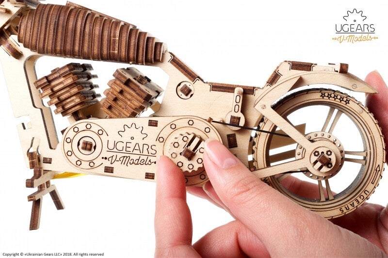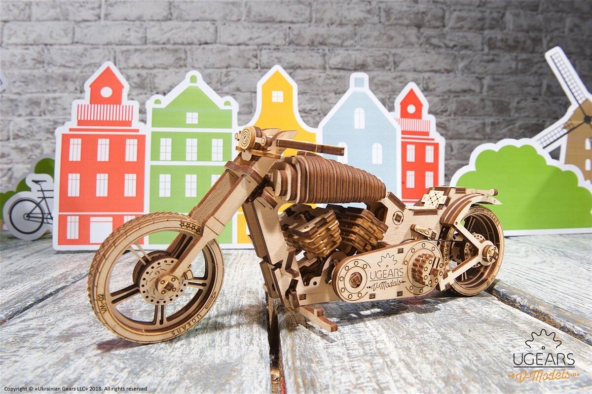 De Motorfiets VM-02 van UGears garandeert urenlang plezier; fantastisch om in elkaar te zetten en fascinerend om keer op keer te laten rijden!
