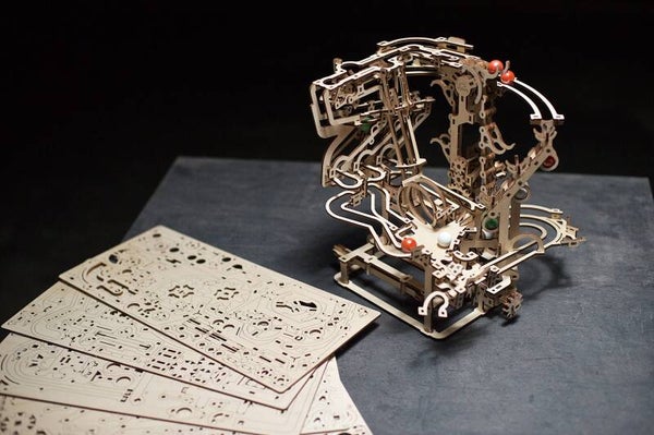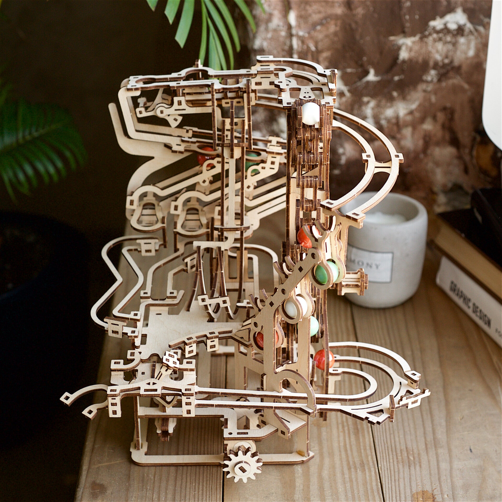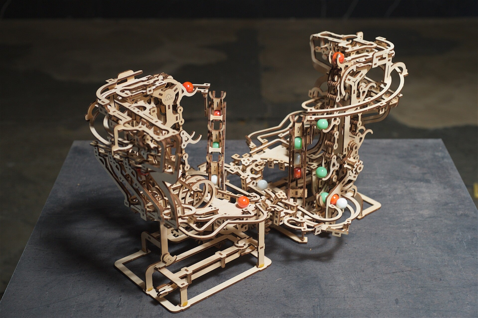 Naast alle voertuigen van UGears is err nu ook een knikkerbaan in het assortiment. De knikkerbaan heeft 400 onderdelen en de bouwtijd bedraagt ongeveer 7 uurtjes. Na het bouwen van de knikkerbaan is het fascinerend hoe de knikkers rond de hindernissen, de hoogtes en de dieptes hun weg vinden. Je kunt zelfs de knikkerbanen van UGears aan elkaar koppelen met het meegeleverde verbindingsstuk.