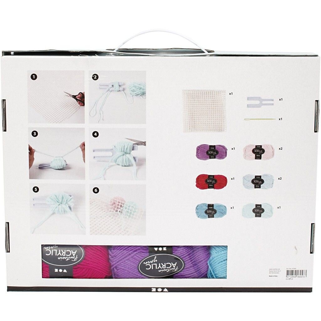 Set garen in verschillende kleuren voor het maken van pom-poms. Kan gebruikt worden voor het maken van een matje of als losse decoratie voor kleding, tassen en schoenen.