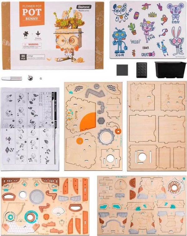 Wat een leuke en educatieve puzzel is deze 3D bloempot in de vorm van een konijntje. De doos bevat 66 houten lasergesneden onderdelen en stap-voor-stap Engelse instructies. Leuk om er alleen aan te werken, maar ook samen. Deze bunnybloempot heeft een hoogte van 22cm en wordt nog leuker met je favoriete vetplantje erin. Geef de bloempot een speciaal plekje op de studeerkamer, op kantoor of gewoon in de woonkamer.